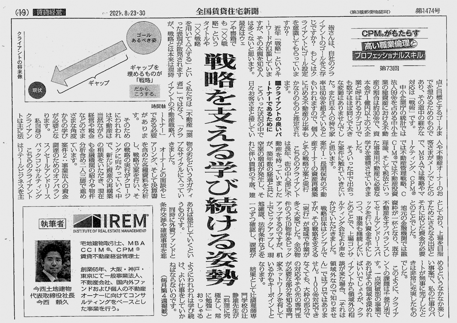 2021年8月23日「全国賃貸住宅新聞」CPMがもたらす高い職業倫理プロフェッショナルスキル第73回にて弊社社長・今西瀬久が「戦略を支える学び続ける姿勢」を執筆しました。