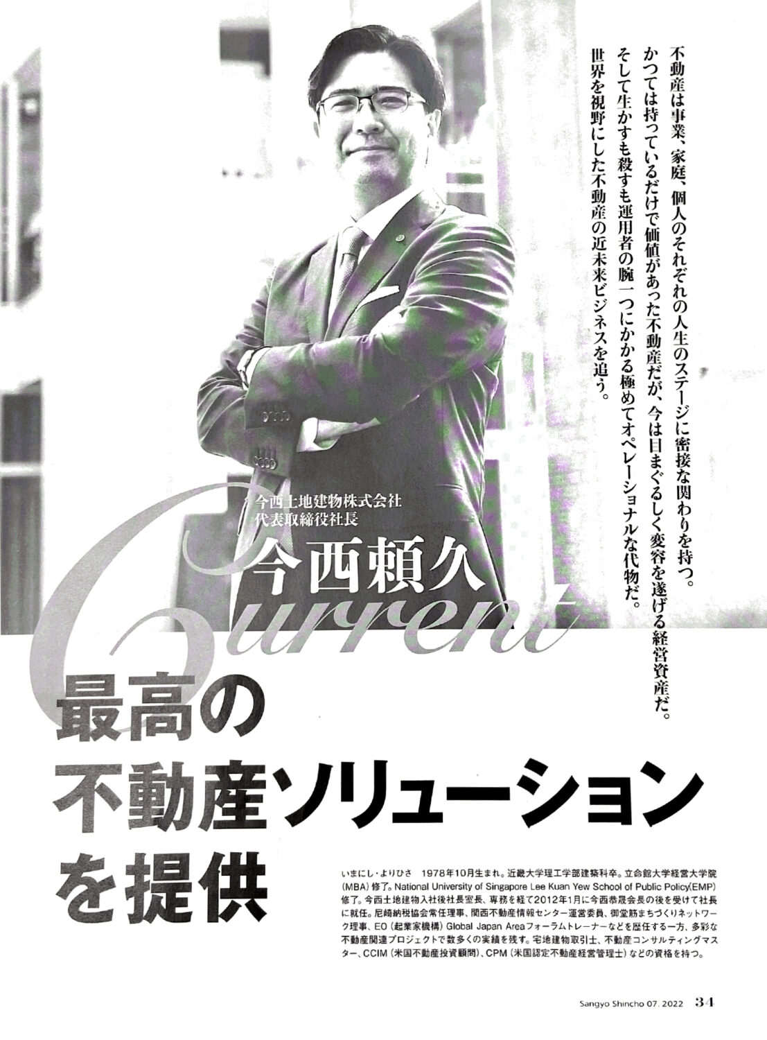 月刊誌「産業新潮」22年7月号 注目の経営者にフォーカスを当てた「CURRENT」にて、弊社社長・今西瀬久のインタビューが掲載されました。