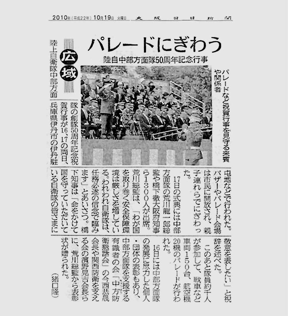 2010年10月19日大阪日日新聞に弊社会長・今西恭晟らが陸自中部方面隊50周年記念行事で表彰状が送られたものが掲載されました。